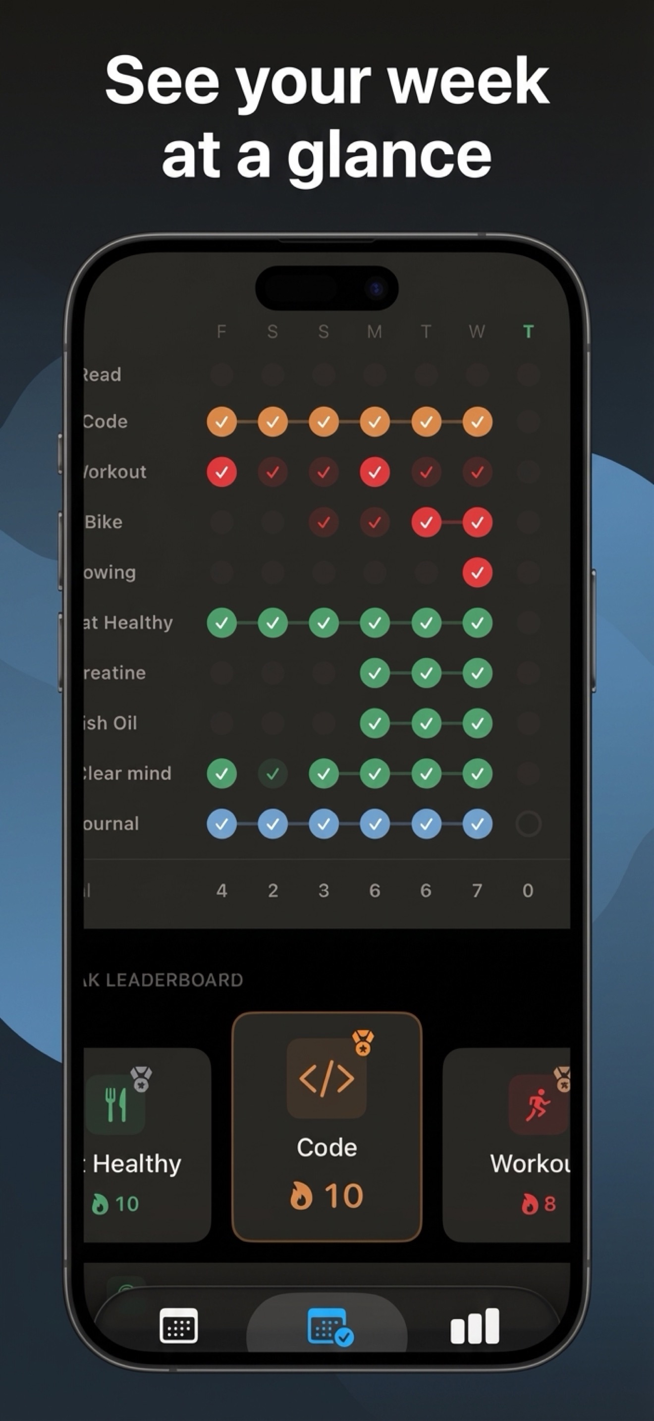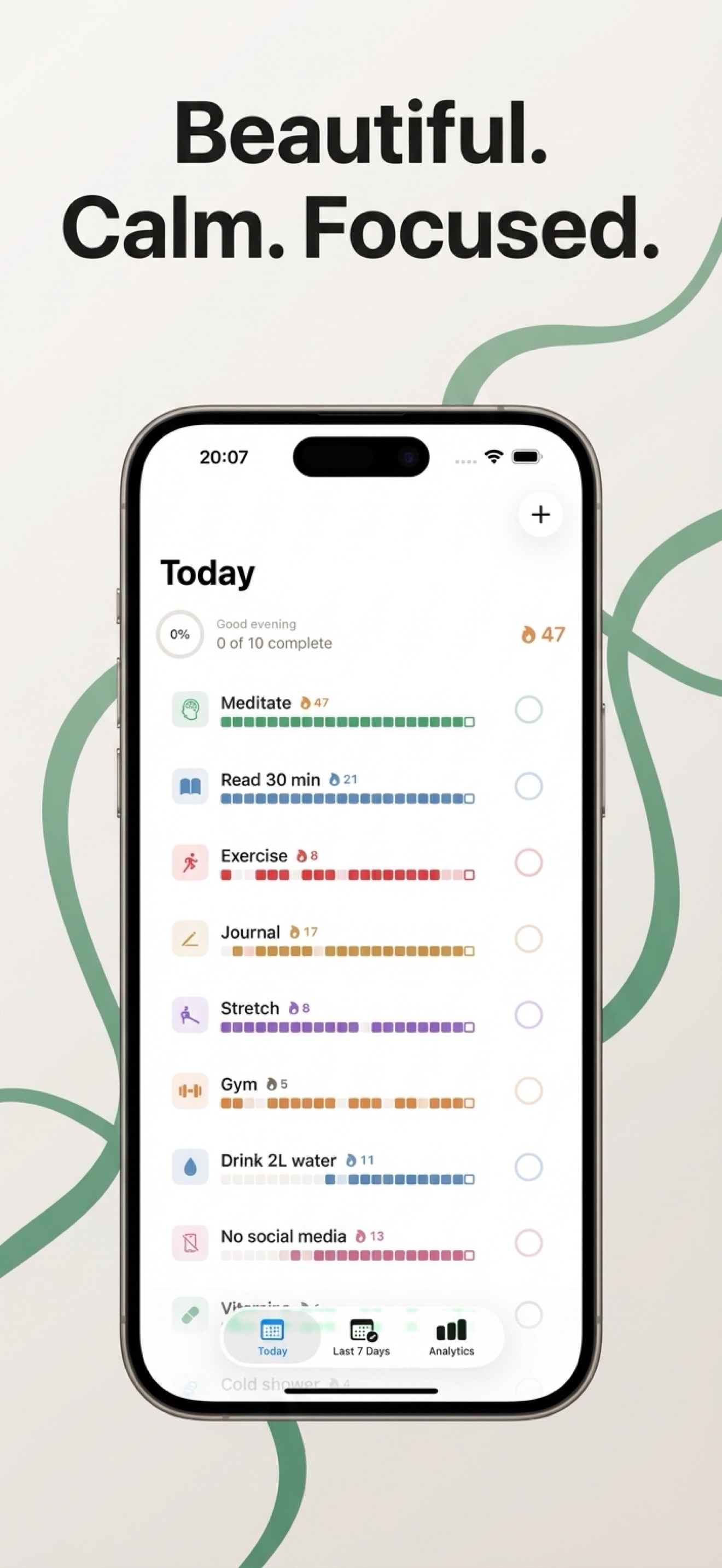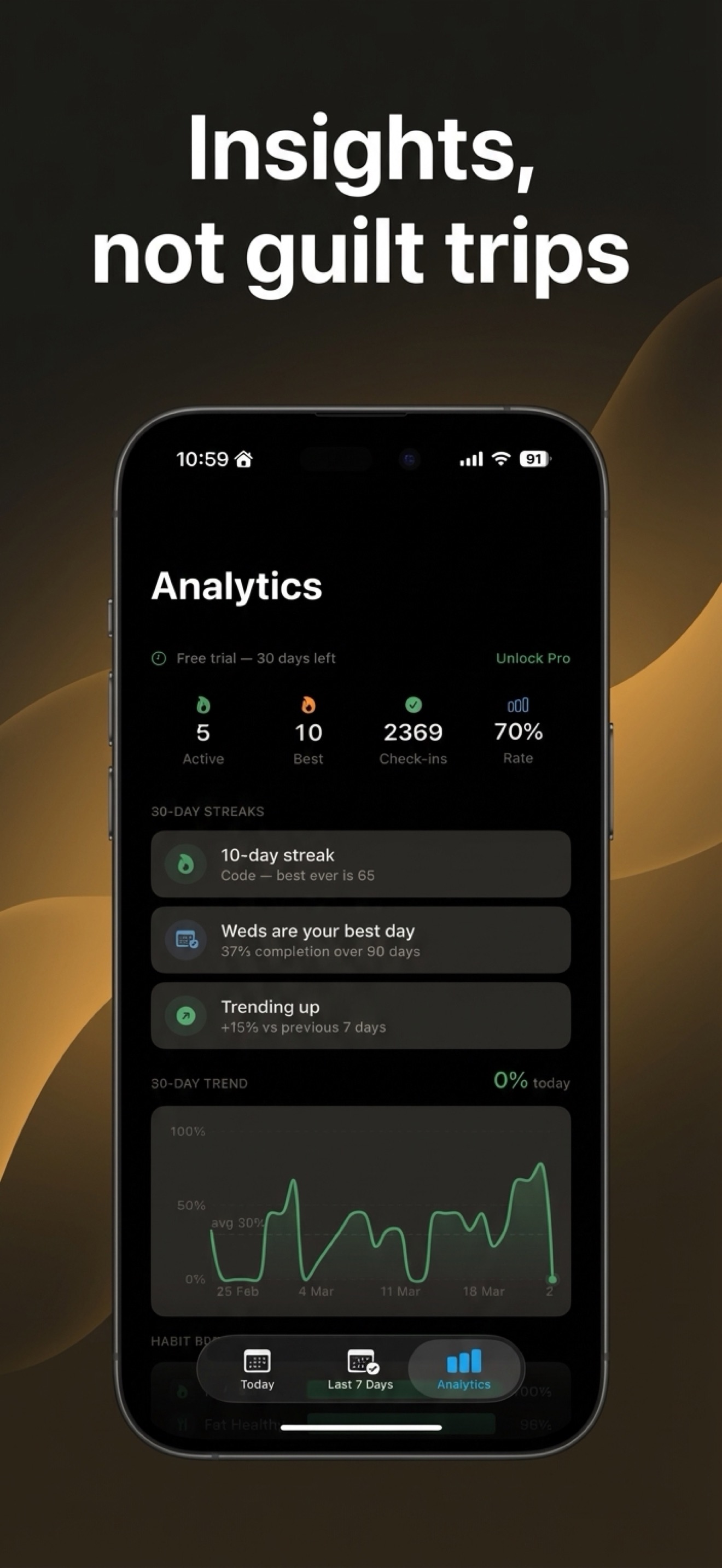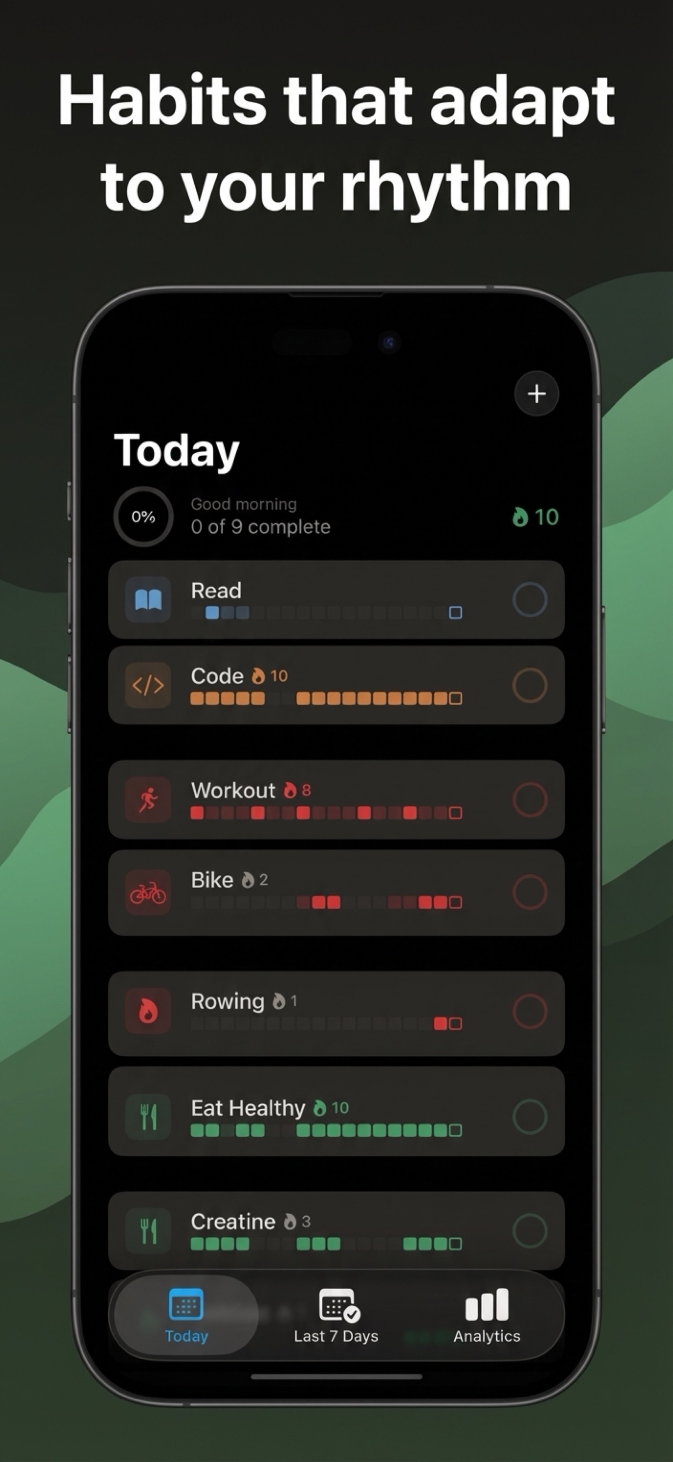 The free tier covers everyday use. A one-time $14.99 Pro upgrade unlocks unlimited habits, analytics with heatmaps, iCloud sync, and all schedule types. No recurring charges, no trials that auto-renew.